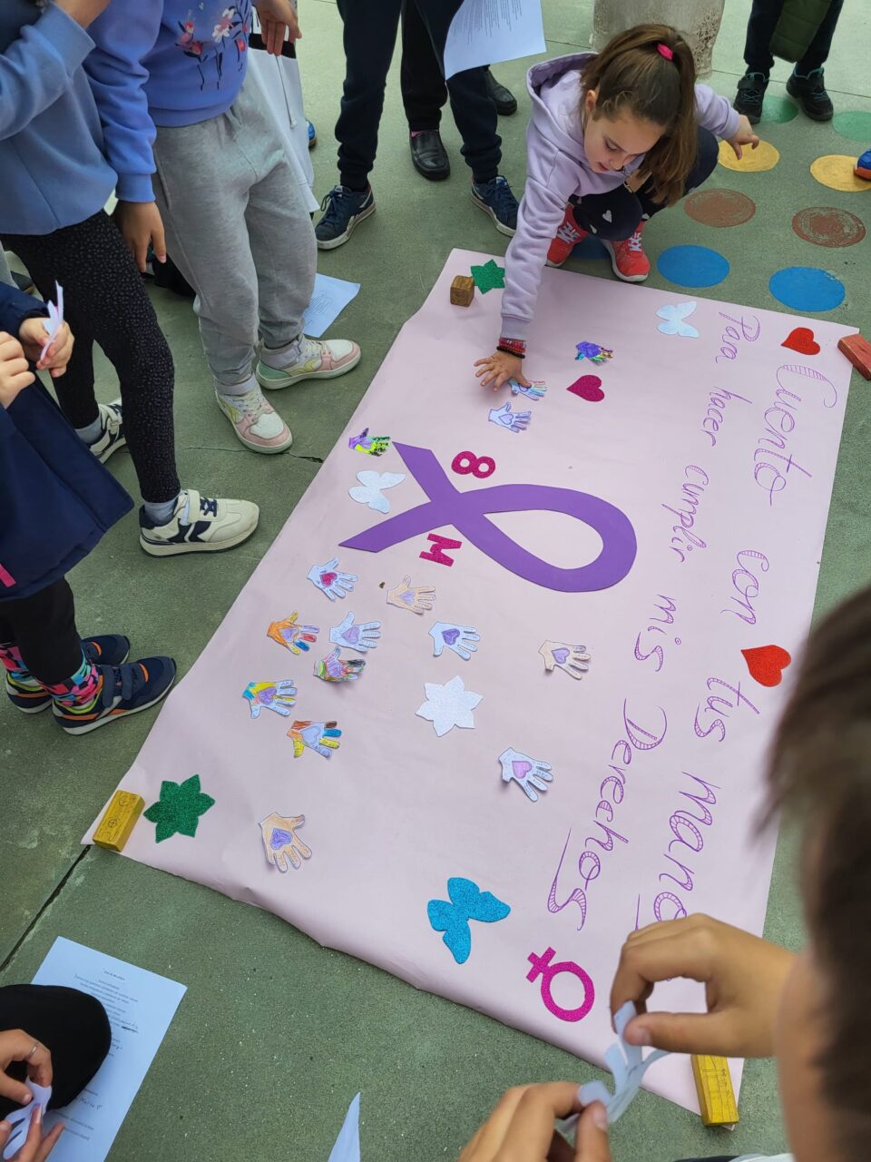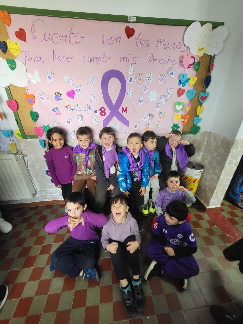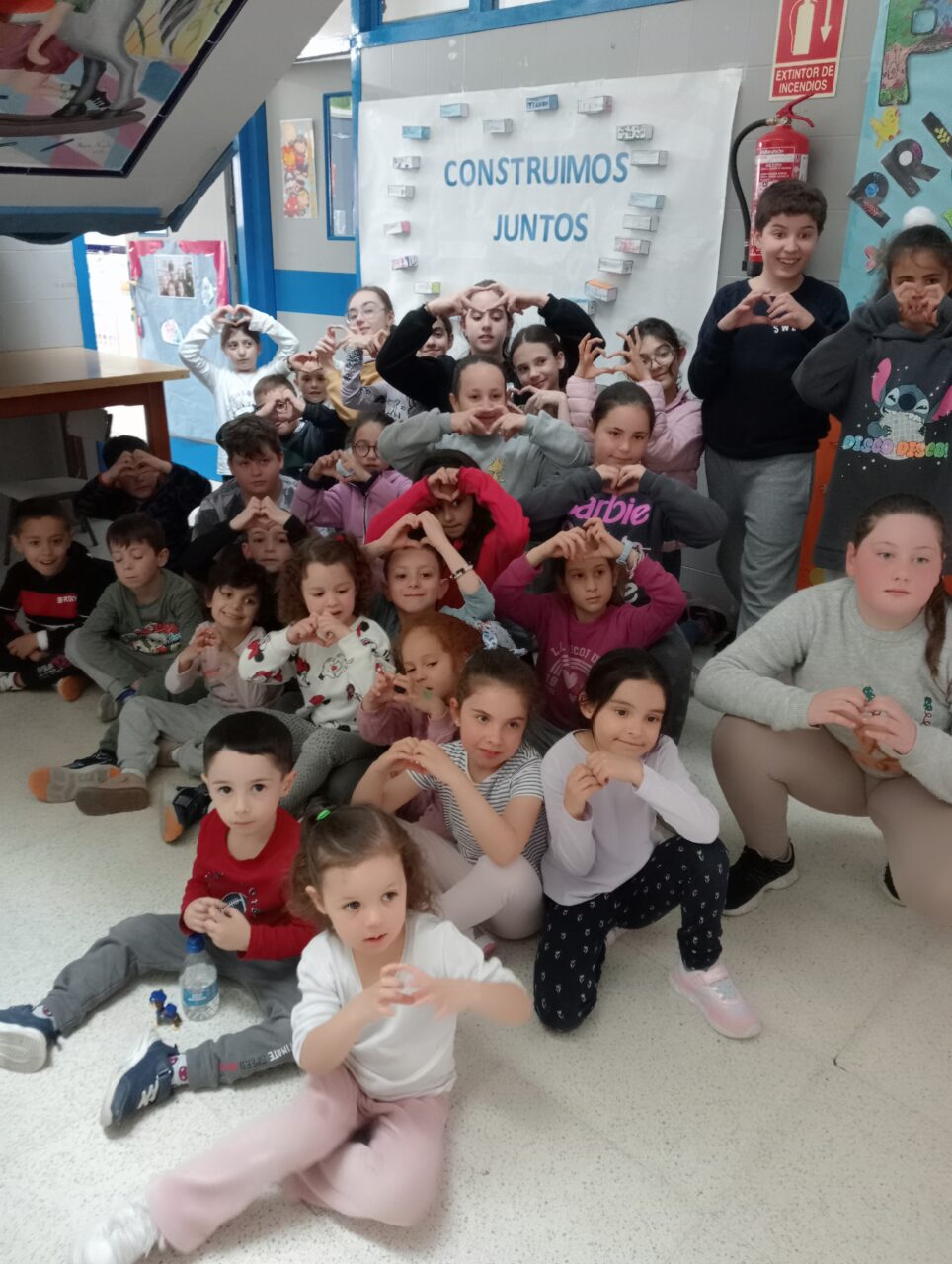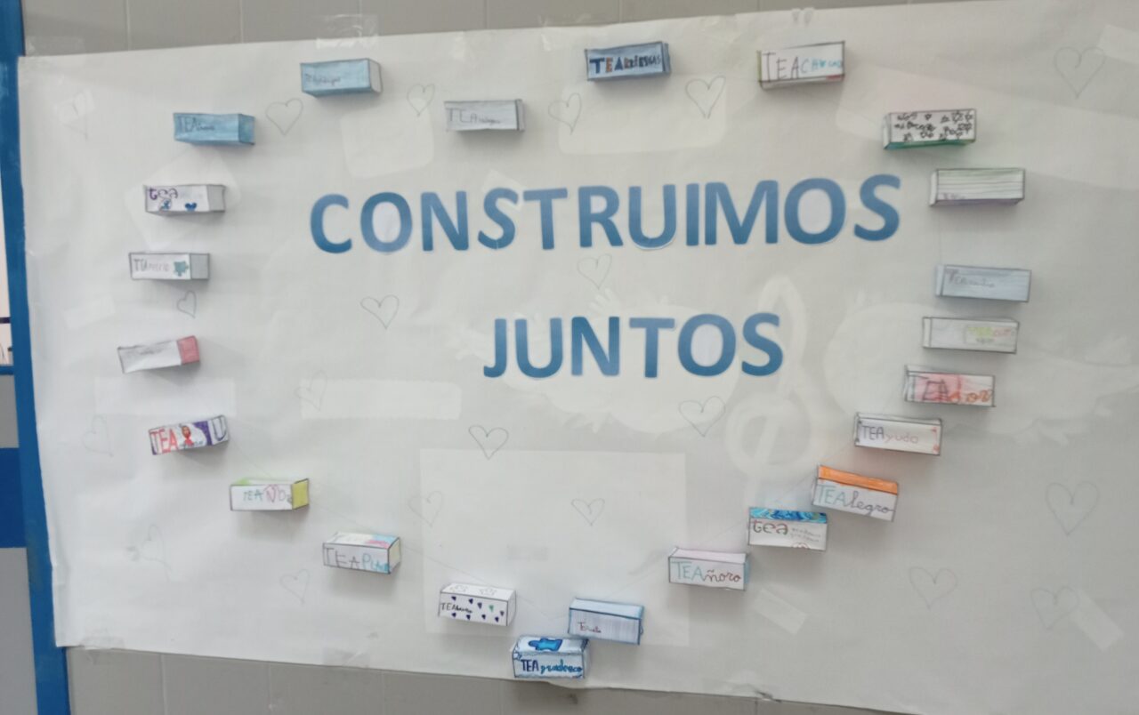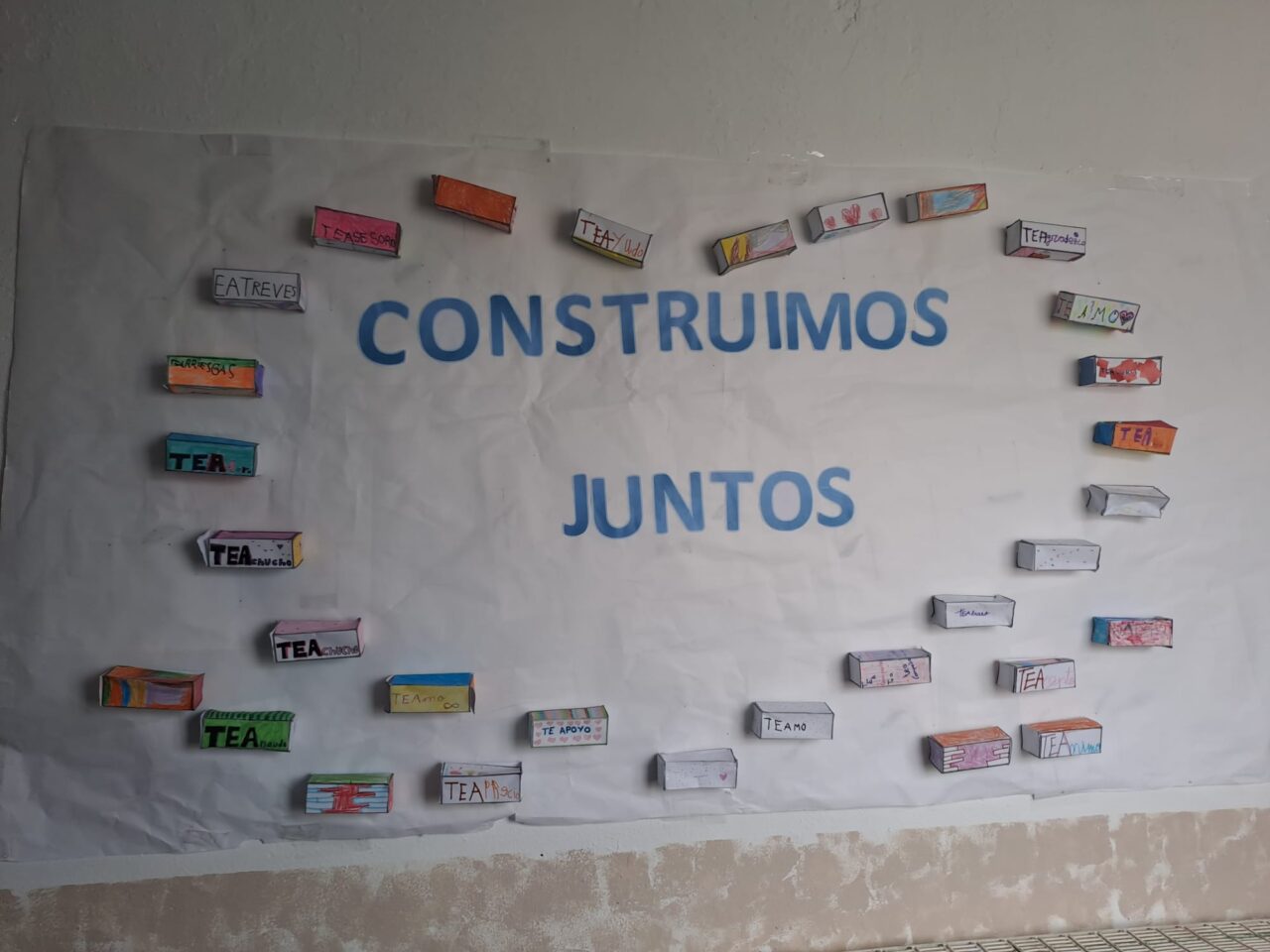 Este año hemos realizado un cartel con el lema «Construimos Juntos» donde hemos puesto unos «ladrillos» elaborados por los alumnos, formando un corazón y que llevaban escritas palabras como: TEAmo, TEAdoro, TEAdmiro…